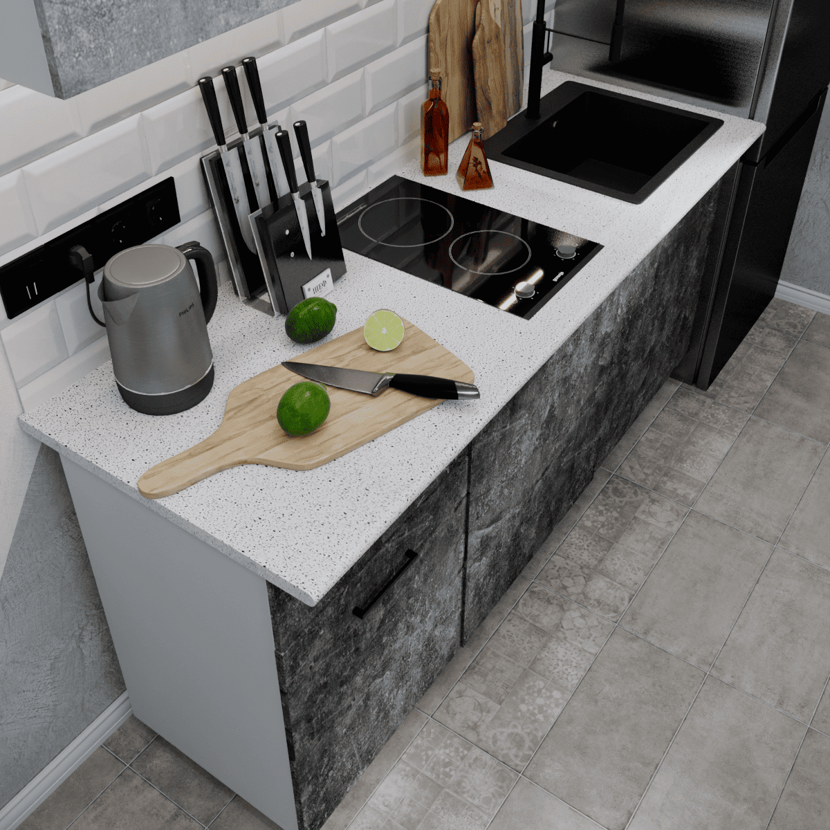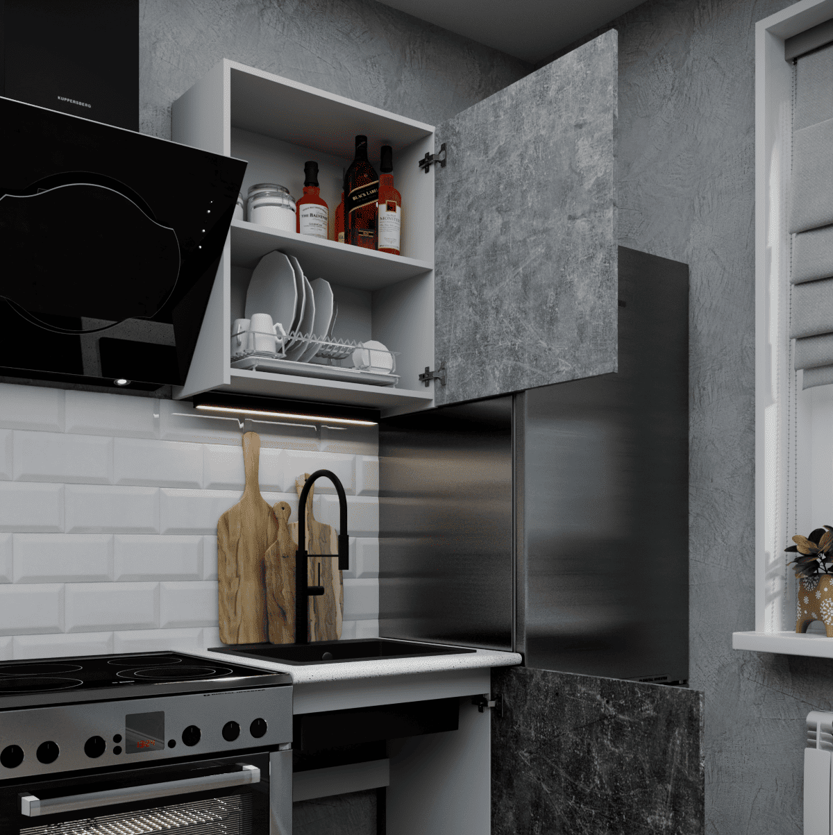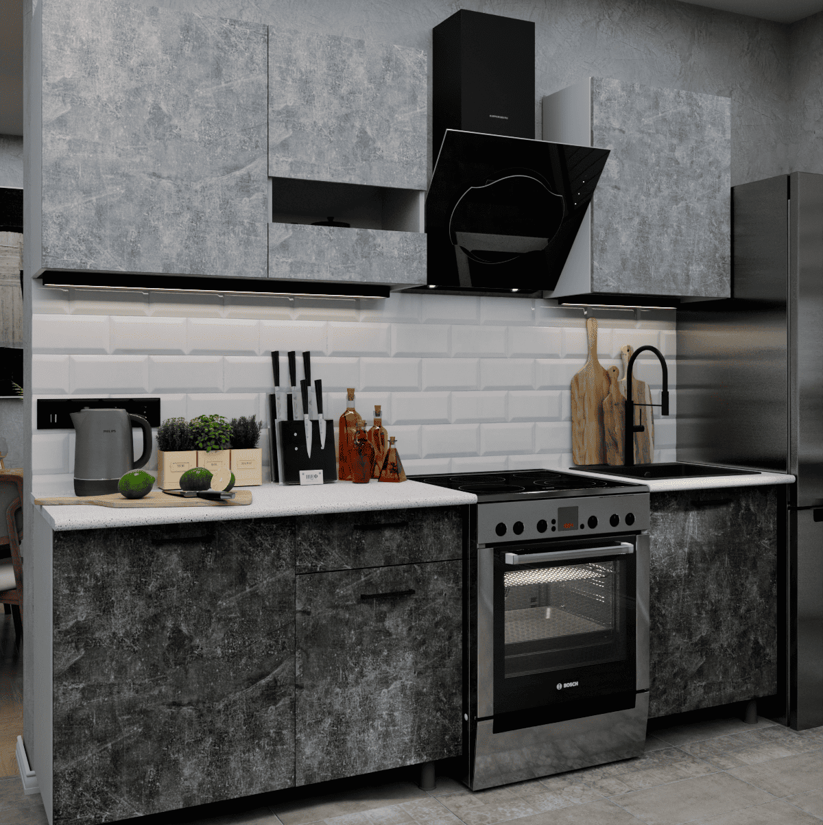 Стильный кухонный гарнитур РОЗАЛИЯ шириной 1700 мм — это современное решение в стиле лофт, выполненное из качественного ЛДСП. Трендовая комбинация фасадов в декорах цемент темный и цемент светлый создает эффектный урбанистический контраст, а изящная стеклостворка в верхнем ярусе добавляет композиции визуальной легкости. Особенностью дизайна является отсутствие лицевой фурнитуры на верхних модулях: они открываются за выступающий снизу торец, что подчеркивает минимализм интерьера. Для функциональной организации рабочего пространства кухня комплектуется практичной раздельной столешницей толщиной 26 мм в цвете Антарес (1100 мм и 600 мм), делая эту модель удобным и эстетичным выбором для вашего дома.