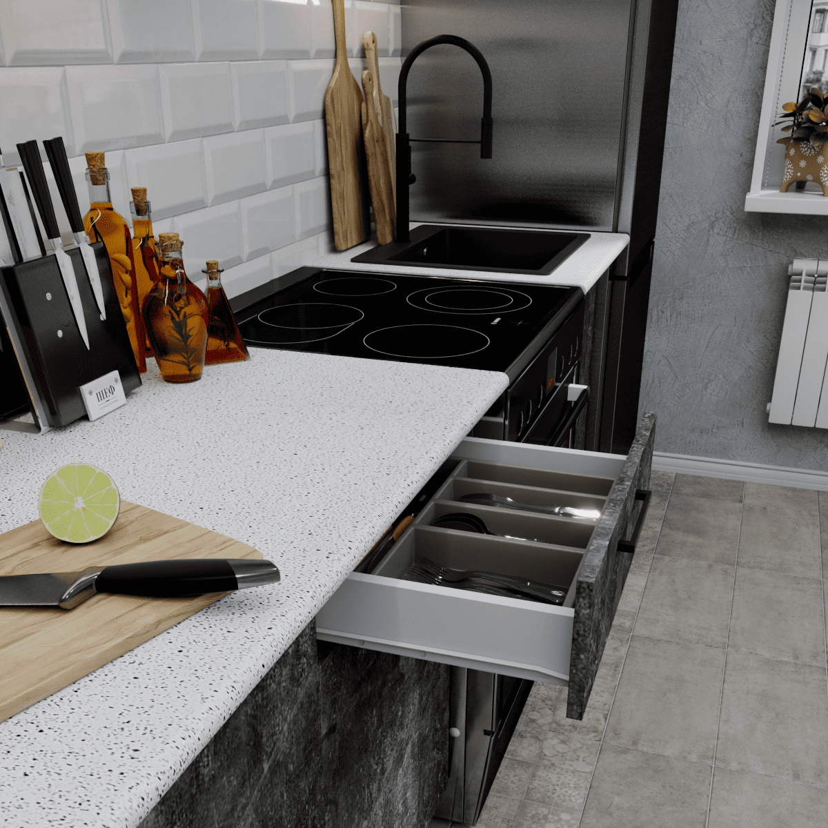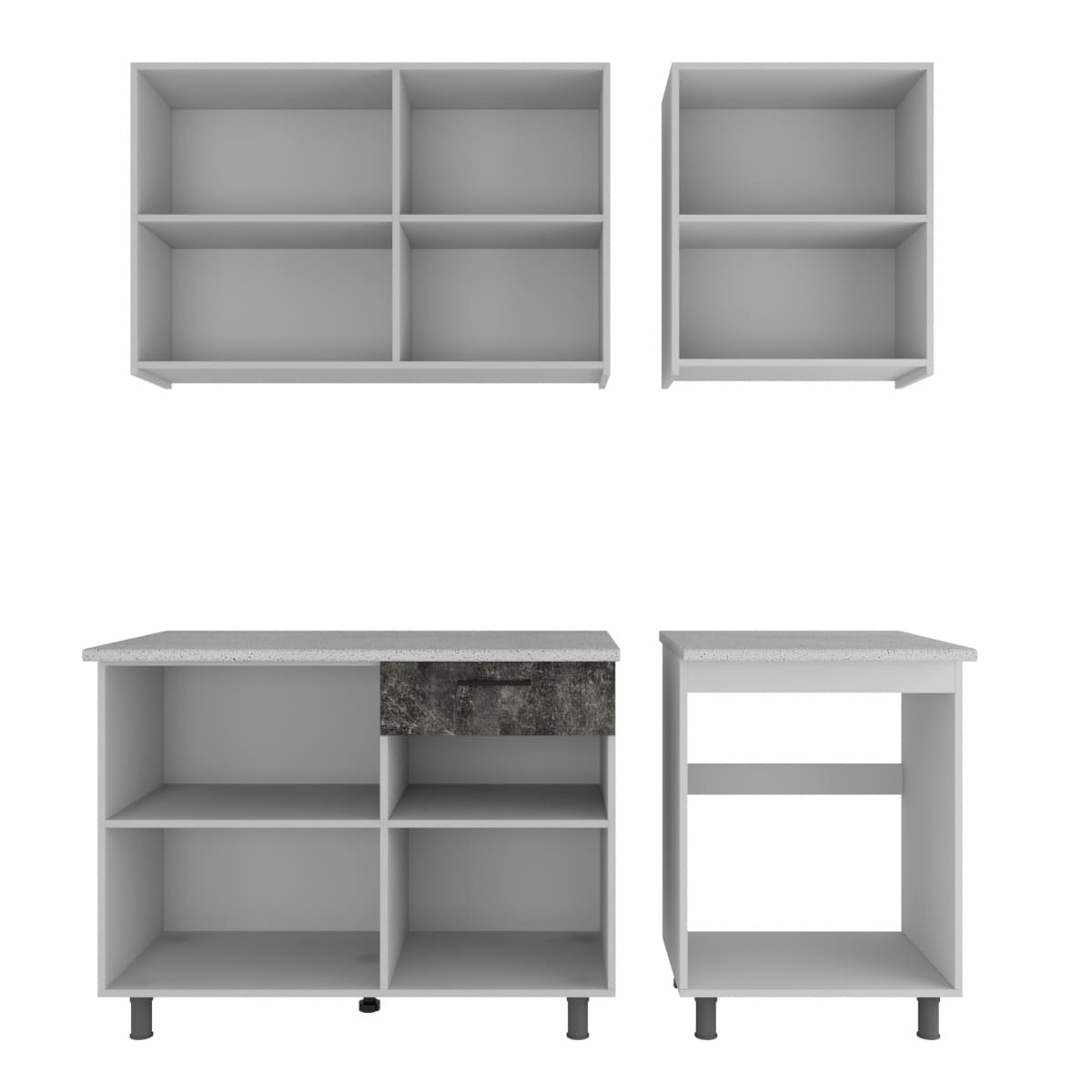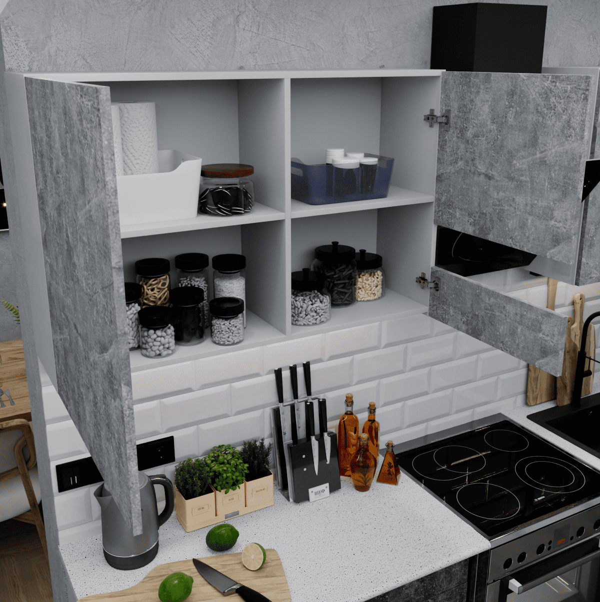 Стильный кухонный гарнитур РОЗАЛИЯ шириной 1700 мм — это современное решение в стиле лофт, выполненное из качественного ЛДСП. Трендовая комбинация фасадов в декорах цемент темный и цемент светлый создает эффектный урбанистический контраст, а изящная стеклостворка в верхнем ярусе добавляет композиции визуальной легкости. Особенностью дизайна является отсутствие лицевой фурнитуры на верхних модулях: они открываются за выступающий снизу торец, что подчеркивает минимализм интерьера. Для функциональной организации рабочего пространства кухня комплектуется практичной раздельной столешницей толщиной 26 мм в цвете Антарес (1100 мм и 600 мм), делая эту модель удобным и эстетичным выбором для вашего дома.