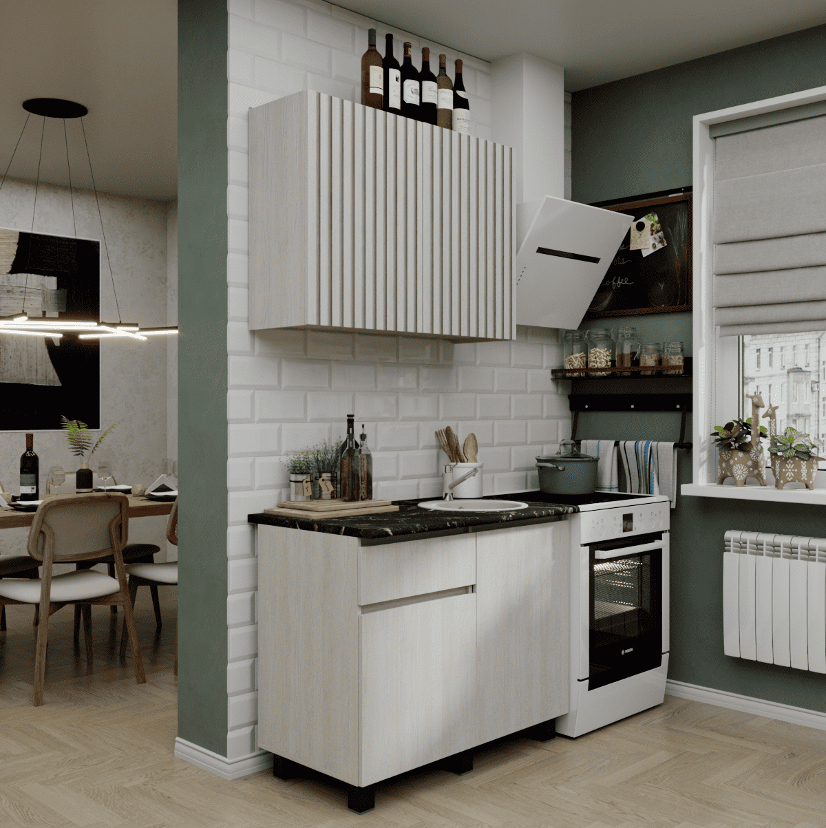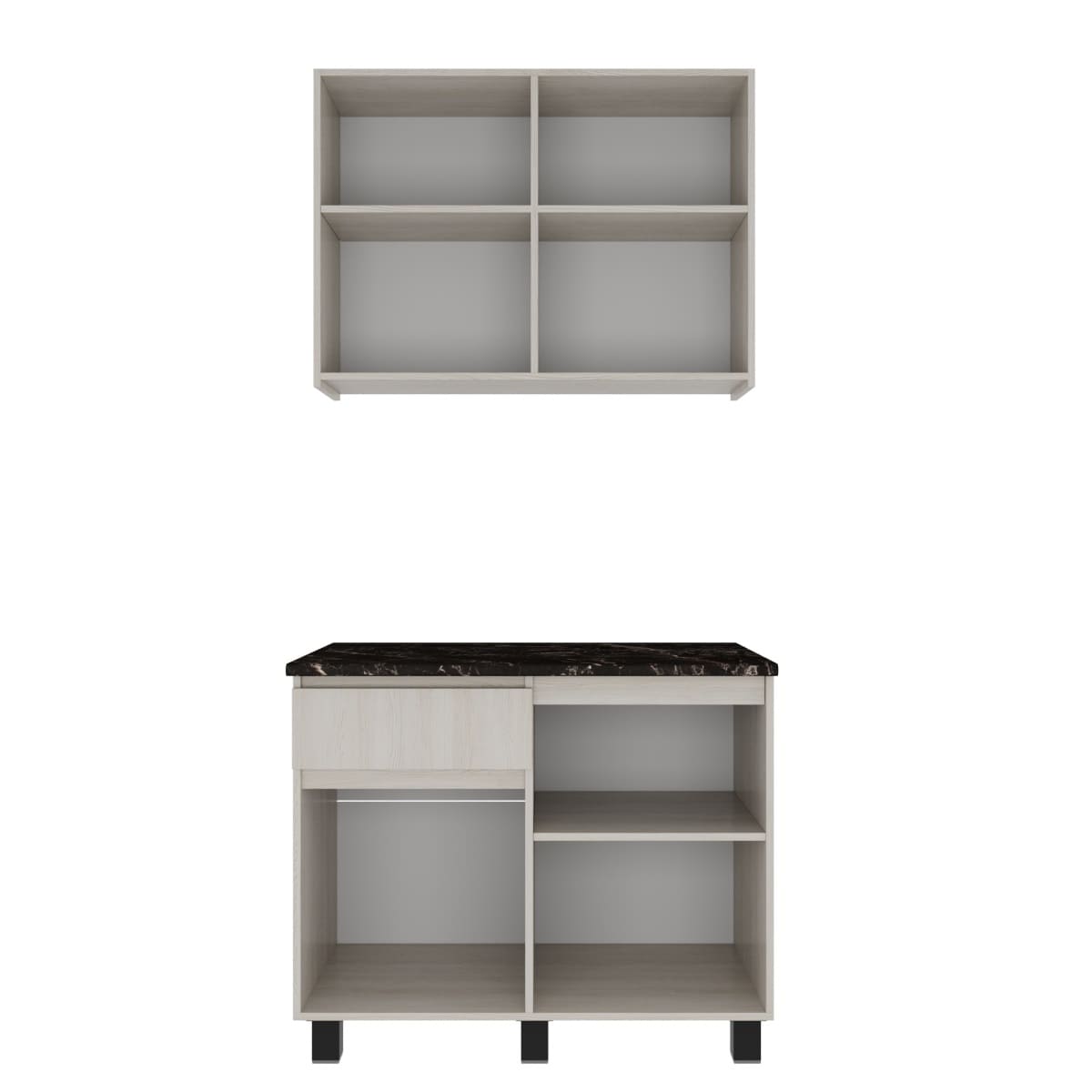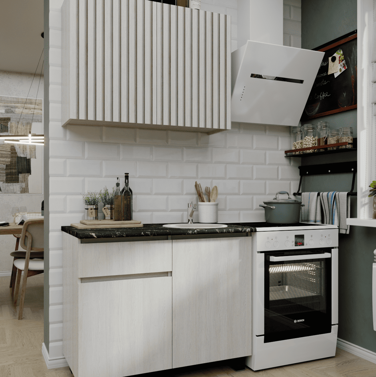 Представляем стильное и функциональное решение для ограниченного пространства — готовая кухня ТРЕНД шириной 1 метр, которая идеально подойдет как кухня для студии, дачи или офиса. Главной изюминкой гарнитура является реалистичная 3D-имитация под натуральную рейку на фасадах, выполненная в декоре Ясень белый, что наполняет интерьер атмосферой уюта и гармонии. Эта маленькая кухня комплектуется надежной цельной столешницей толщиной 38 мм в эффектном цвете Черный янтарь, создающей выразительный контраст со светлым деревом. Продуманная конфигурация включает один навесной модуль и один вместительный модуль внизу, обеспечивая удобство хранения и полноценное рабочее место даже на минимальной площади.