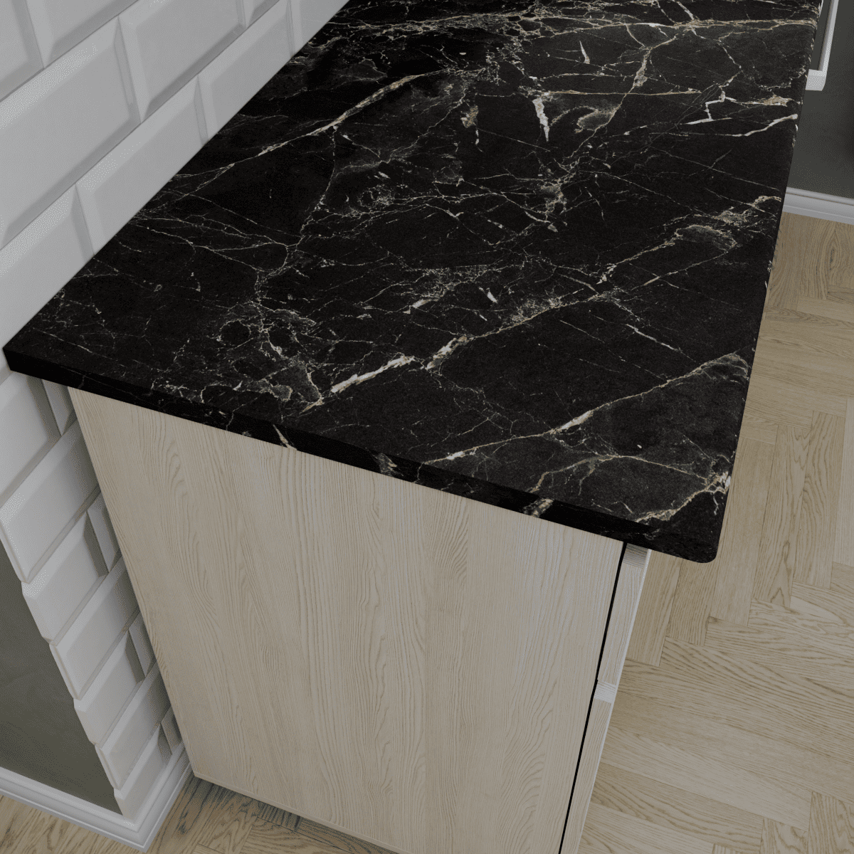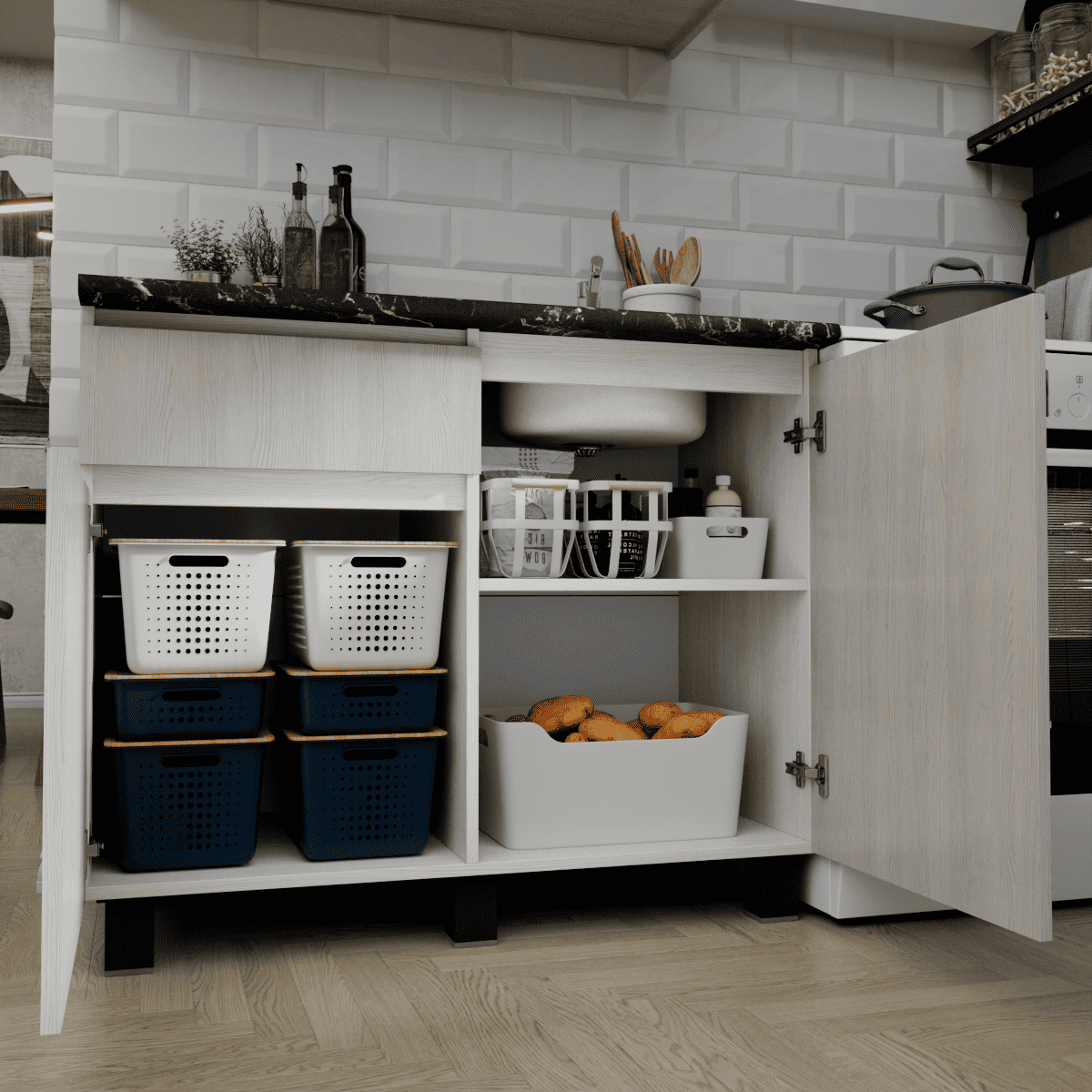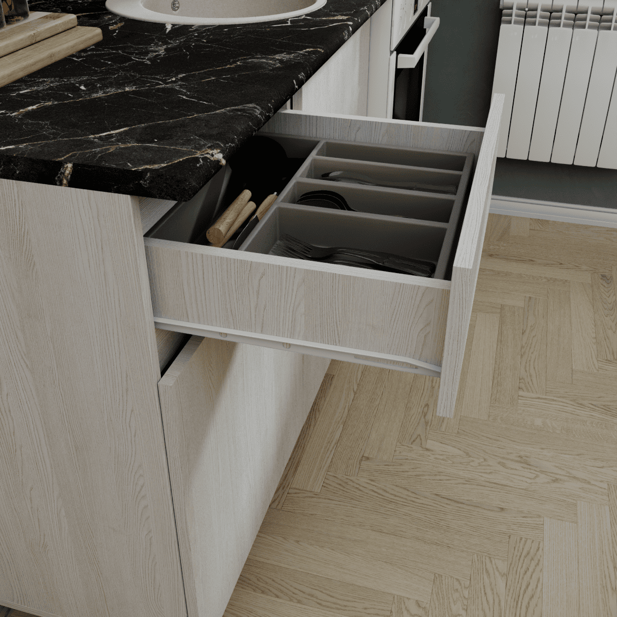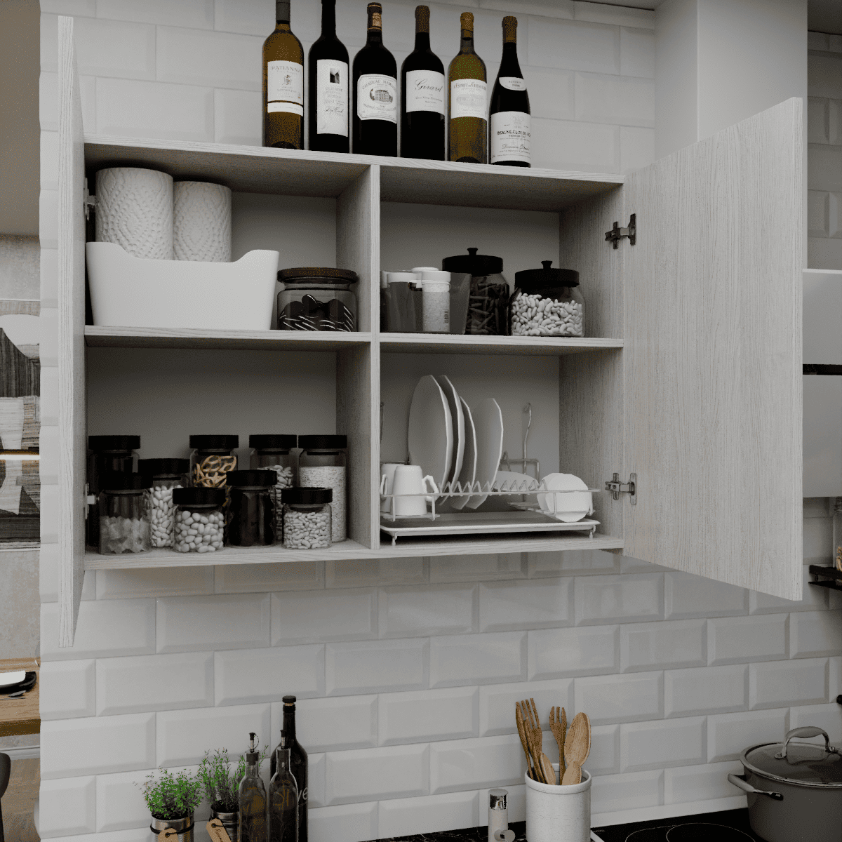 Представляем стильное и функциональное решение для ограниченного пространства — готовая кухня ТРЕНД шириной 1 метр, которая идеально подойдет как кухня для студии, дачи или офиса. Главной изюминкой гарнитура является реалистичная 3D-имитация под натуральную рейку на фасадах, выполненная в декоре Ясень белый, что наполняет интерьер атмосферой уюта и гармонии. Эта маленькая кухня комплектуется надежной цельной столешницей толщиной 38 мм в эффектном цвете Черный янтарь, создающей выразительный контраст со светлым деревом. Продуманная конфигурация включает один навесной модуль и один вместительный модуль внизу, обеспечивая удобство хранения и полноценное рабочее место даже на минимальной площади.
