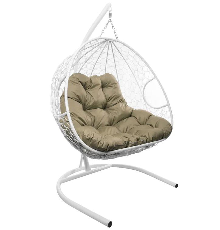 Кресло подвесное ДЛЯ ДВОИХ с ротангом // бежевая подушка, белый