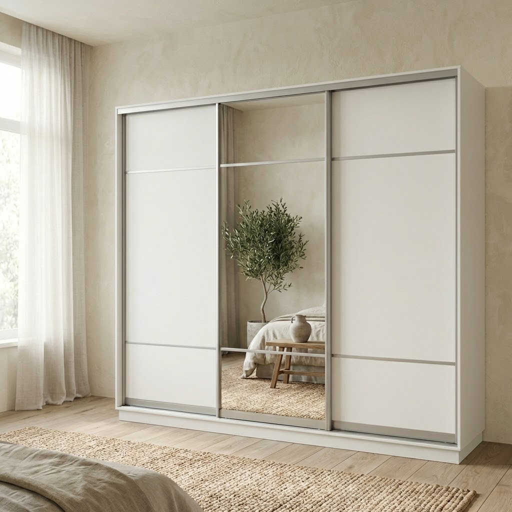 Грандиозный шкаф-купе КЛАССИКА 58 шириной 2400 мм — это полноценная система хранения, способная заменить гардеробную комнату для большой семьи. Три раздвижные створки оформлены в современном стиле: центральная дверь с ростовым зеркалом визуально облегчает этот большой белый шкаф, а боковые глухие фасады скрывают содержимое от посторонних глаз. Внутреннее пространство глубиной 600 мм организовано с идеальной симметрией: по краям расположены секции с глубокими полками для белья, а в центре находится отделение со штангой для плечиков, дополненное двумя функциональными нишами сверху и снизу. Если вы ищете вместительный трехдверный шкаф с зеркалом и планируете купить шкаф-купе в спальню или просторную гостиную, модель КЛАССИКА 58 станет вашим лучшим выбором. Продуманное наполнение шкафа штанга и полки гарантирует удобный доступ к вещам и безупречный порядок в доме.