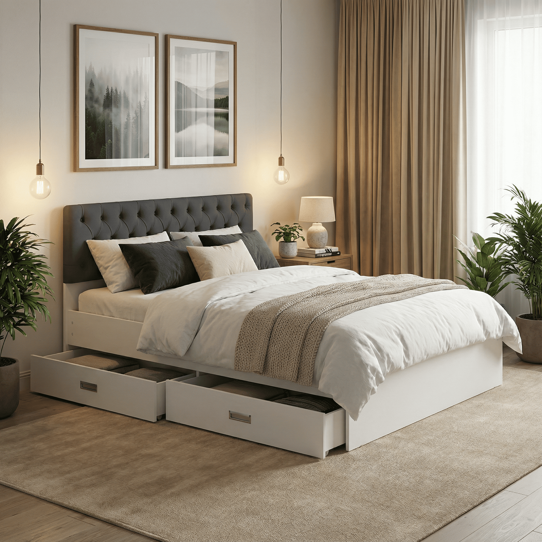 Стильная кровать №7 с мягкой спинкой в эффектном контрастном исполнении — белоснежный корпус и обивка велюр графит 032 — станет современным и уютным центром вашей спальни. Эта комфортная полутораспальная модель со спальным местом 1400х2000 мм оснащена надежным реечным основанием (ладе), которое обеспечивает правильную вентиляцию матраса и здоровый сон. Для максимальной функциональности в конструкции предусмотрены вместительные выкатные ящики на колесах-роликах, идеально подходящие для хранения объемного постельного белья, подушек и сезонных вещей. Главным плюсом продуманной эргономики является универсальная сборка ящиков, позволяющая разместить их с любой удобной стороны в зависимости от планировки вашей комнаты. Если вы ищете оптимальное сочетание эстетики и практичности и планируете купить кровать 140х200 с ящиками, эта элегантная модель подарит вам идеальный отдых и поможет грамотно организовать пространство.