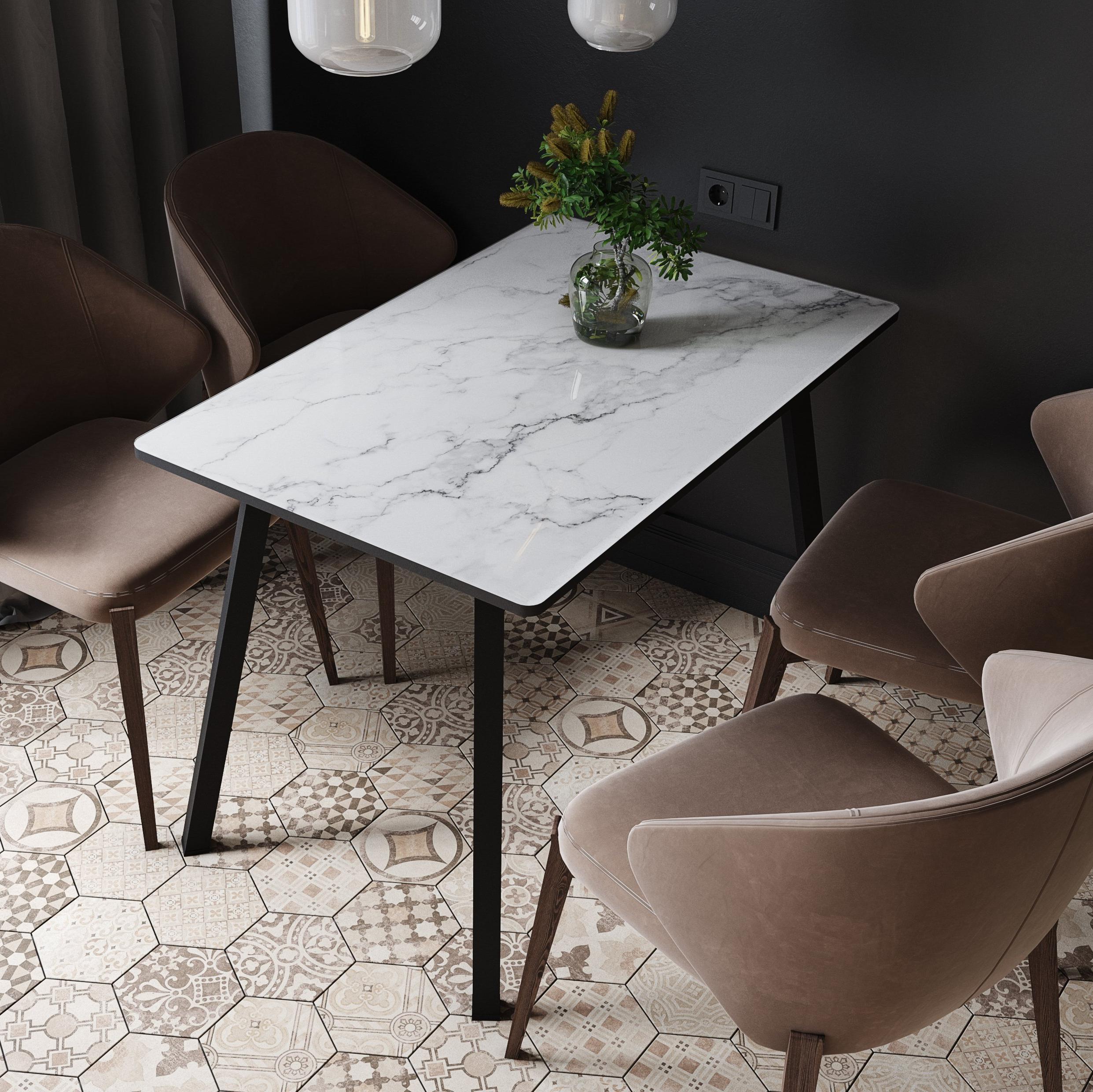• Массивные металлические опоры черного цвета и столешница с мраморным рисунком (на выбор “Блэк Стоун”, “Вайт Стоун” или “Грей Стоун”) подчеркивают лофтовый характер стола.